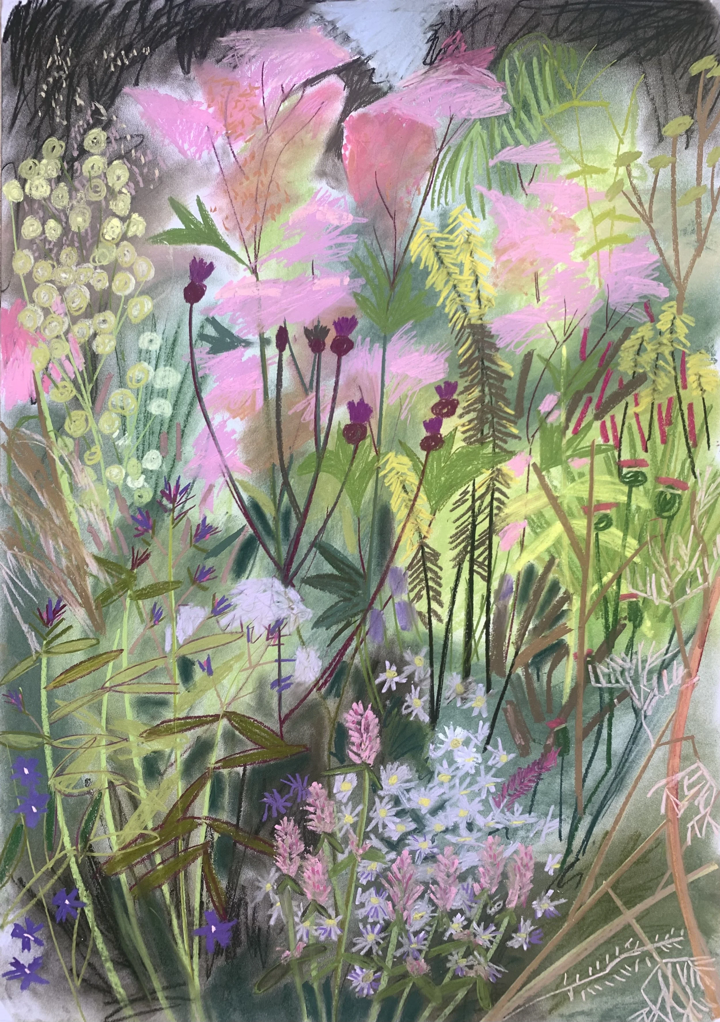 Over the past two years I’ve been making regular visits to Arcadia Garden in Sheffield, a unique naturalistic, perennial garden which is full of different habitats including woodland, meadows tall herbaceous planting, and is constantly changing with the seasons. I’ve spent hours drawing directly from life, striving to capture those shifting moments as the garden moves through its cycle.